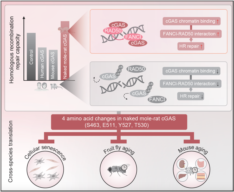 该项比较生物学研究首次揭示长寿物种通过DNA修复抑制因子cGAS的蛋白序列变化以增强基因组稳定性并促进个体长寿,提示未来或可通过小分子药物或基因编辑等模拟裸鼹鼠特有变异,为人类对抗生殖衰老、促进健康长寿开辟了新路径。