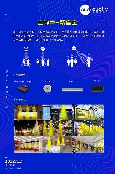 聚音寶作為我國(guó)首個(gè)實(shí)現(xiàn)商業(yè)化的定向音響,基于超聲波的穿透性強(qiáng),指向性能高的優(yōu)勢(shì)研發(fā)而成,將可聽聲調(diào)制到超頻波段,打破了可聽聲四面?zhèn)鞑?dǎo)致聲波無法百分百傳遞到指定位置的局限性,聲音只在扇形區(qū)域傳播,區(qū)間外則不受干擾,像手電筒照射一樣。