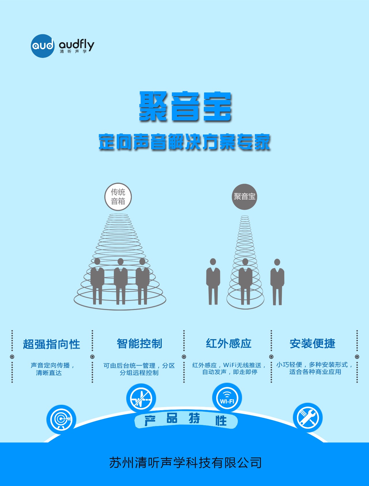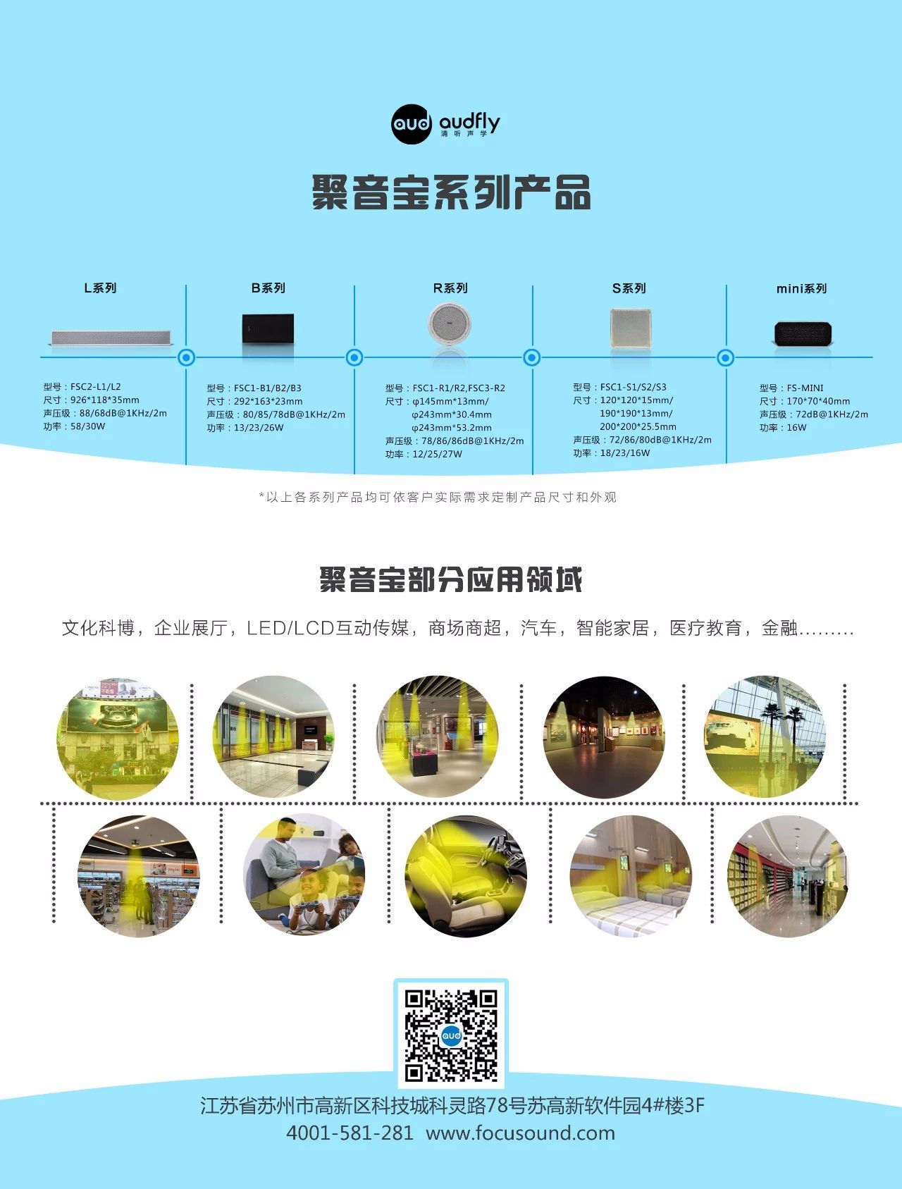 聚音寶是一款融合了定向聲技術的高科技超指向揚聲器,憑借其聲音超強指向性、音源立體定位以及防治噪音產生等特點,截至目前,已廣泛應用于博物館、展廳等展覽展示工程、LED/LCD音視頻廣告集成、商場超市、銀行、醫院、汽車等20多個行業領域,提供專業的定向聲解決方案。