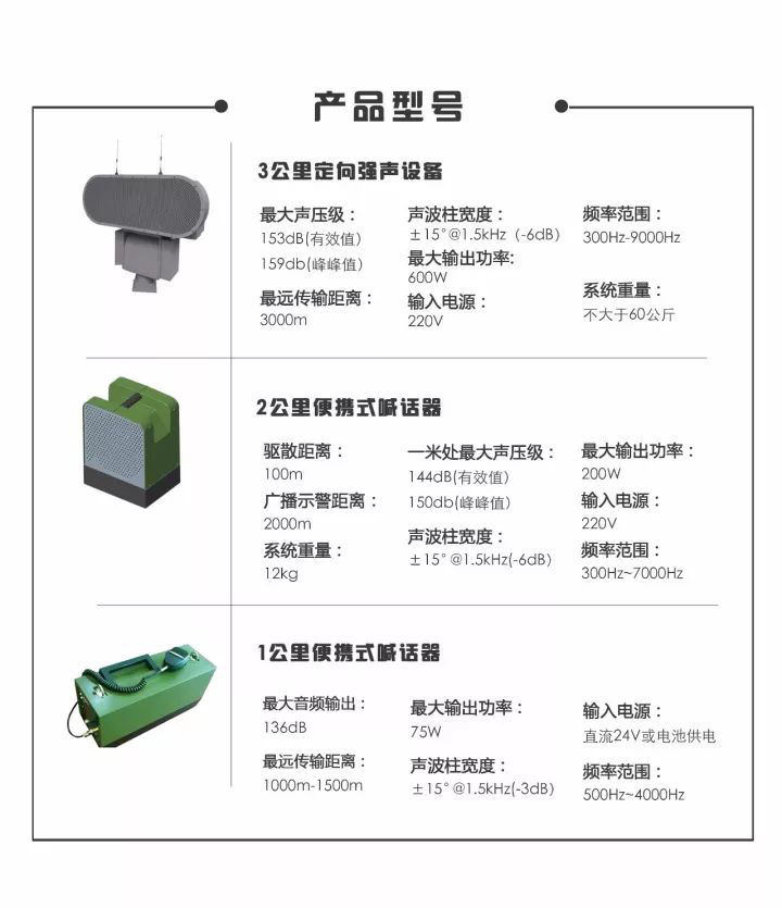 遠距離喊話與警示,機場、大型艦船驅鳥,重要場所、關鍵區域防護,反恐維穩,監獄安防,海上執法,邊境防衛,主權昭示……