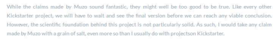 有外國網(wǎng)友評價(jià):Muzo這個(gè)產(chǎn)品申明太好了,以至于好的不太真實(shí)。同時(shí)他還覺得這個(gè)項(xiàng)目背后的科學(xué)基礎(chǔ)并不堅(jiān)實(shí)。