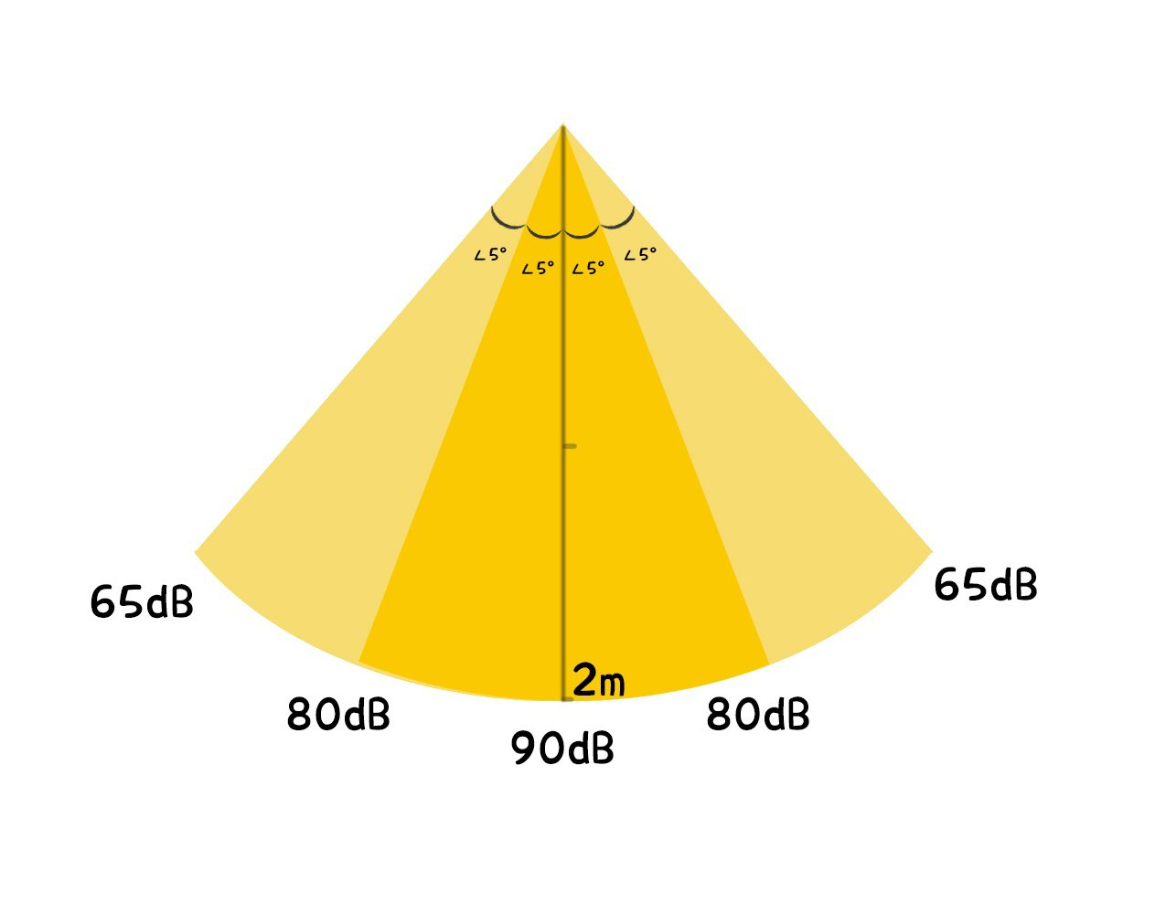定向音箱的聲波是在聲源正前方區(qū)域呈扇形傳播,具有方向和角度。聲源正前方音量可達(dá)最高,且遠(yuǎn)距離傳播音量幾乎是沒有衰減的,具體傳輸距離是根據(jù)應(yīng)用需求,調(diào)整聲學(xué)算法確定的。