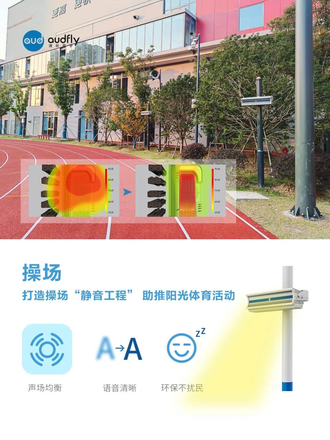 學校操場定向廣播系統,利用定向聲技術,實現聲音分區控制,將聲音控制在操場范圍內清晰傳播,有效解決了傳統操場全向聲廣播系統對教學樓、辦公樓及附近居民樓造成噪音擾民的問題;通過聲場設計,實現操場聲場均衡,解決傳統操場廣播混響、聲音異步、延時等問題,增強語音清晰度與可懂度,幫助營造健康向上的操場聲環境,助力陽光體育活動開展,推動科技生態校園建設。