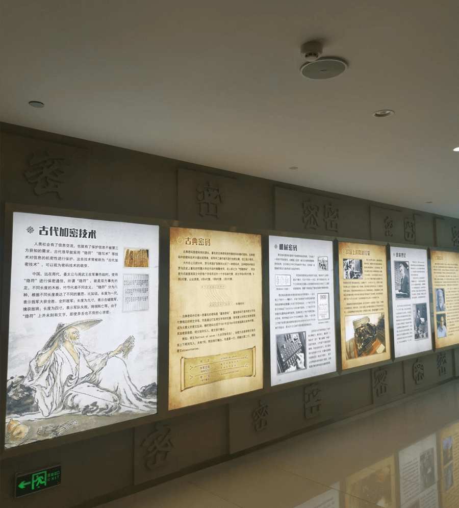 展館2018年10月正式啟用,面積約600平方米,是一個展示密碼文化、普及密碼知識及介紹商密產品的主題展示廳。展示內容分五部分:密碼文化及知識普及區、密碼的歷史及發展歷程區、密碼產品應用行業介紹與閱讀體驗區、密碼產品展示區和密碼技術培訓區。